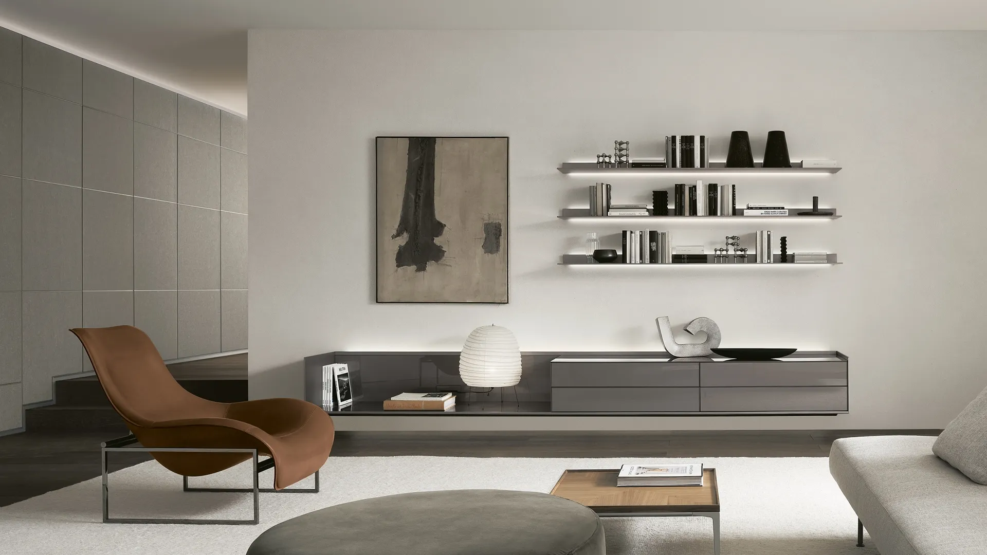 La Parete Attrezzata sospesa Self Plan Peltro di Rimadesio in foto è una delle più originali soluzioni d’arredo in commercio: componibilità su misura e le varie possibilità di progettazione la rendono pratica e sofisticata. Rimadesio produce inediti modelli di mobili soggiorno, diversi per stile e forme, finiture e componenti: scopri nel nostro showroom l'Arredamento Casa delle migliori marche. I mobili soggiorno in vetro dalle linee moderne come il modello in foto sono veramente eclettici e capaci di arredare la zona giorno sfruttando bene ogni angolo. Lasciati ispirare da una ricca gamma di arredi per la zona giorno e potrai trovare la parete attrezzata che fa al caso tuo. Poiché il soggiorno deve essere uno spazio agevole e di grande valore estetico, sono molto utili alcuni arredi belli e funzionali come le Pareti Attrezzate.
